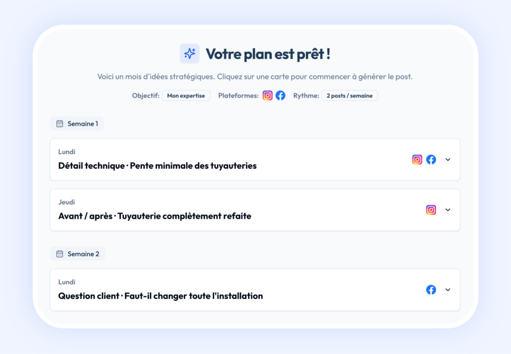 Indiquez votre métier, trouvez des idées et obtenez un post prêt à publier en quelques clics.